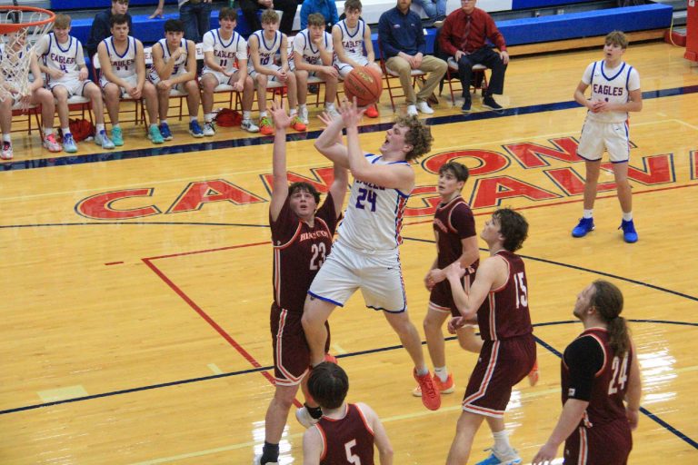 Wyatt Collins goes up for a shot in the paint during the second half of the Canton-Galva boys basketball team’s 87-70 win over Herington on Tuesday, January 30. Photo by Joel Muhs