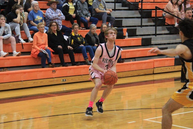 Braylon Olsen pulls up for a jump shot during Smoky Valley’s 65-25 loss to Haven on Friday, February 9. Olsen finished with a team-high seven points for the Vikings. Photo by Joel Muhs