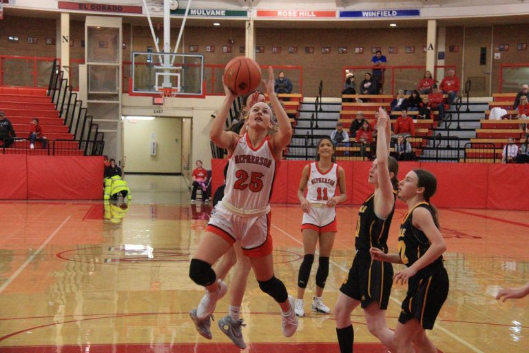 Karter Alvord goes up for a layup during the third quarter against Andale. Alvord finished with 12 points for McPherson, including eight points in the third quarter alone during the Lady Pups’ 66-46 win. Photo by Joel Muhs