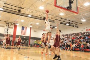 Cammi Unruh takes the ball inside during Moundridge’s 75-26 win over Herington on Monday, February 26 to open sub-state play. Unruh finished the game with 15 points. Photo by Joel Muhs
