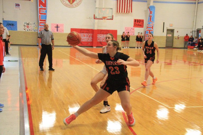 Morgan Froese saves the ball from going out of bounds during the first half against Trinity Catholic. Froese scored 10 points during Inman’s 66-32 win over the Celtics. Photo by Joel Muhs