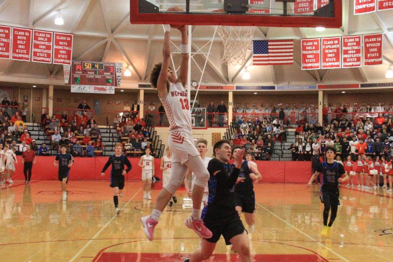 Kyden Thompson rises up for a dunk during the first quarter of McPherson's 76-53 win over No. 3 Circle on Friday, February 16. Thompson finished with a career-high 32 points in the win. JOEL MUHS